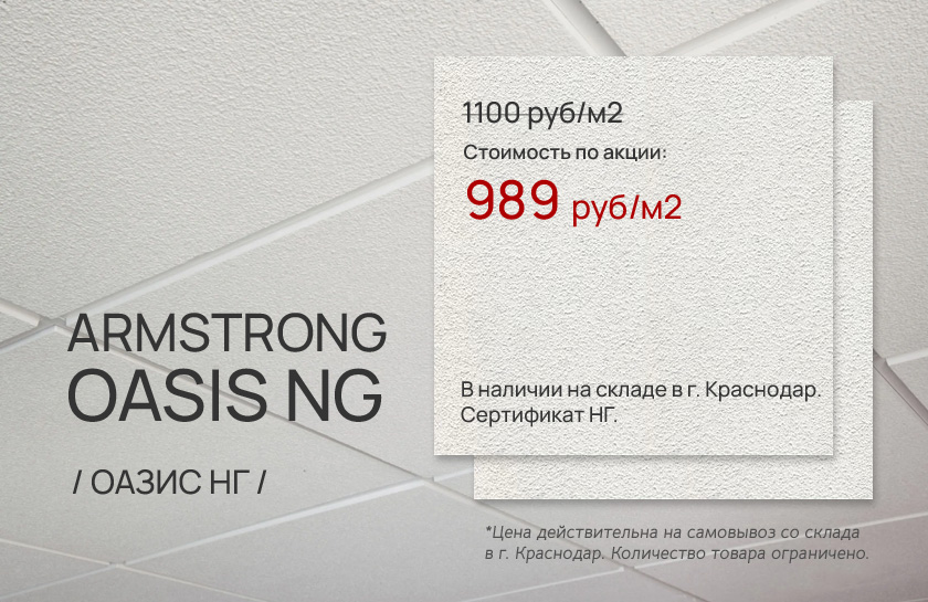 Выгодное предложение для тех, кому нужен потолок высокого качества с сертификатом НГ. Идеальное решение — минеральная потолочная плита ARMSTRONG OASIS NG (Оазис НГ) — по цене 989 руб/м2*, вместо 1100.
